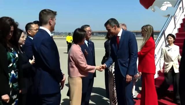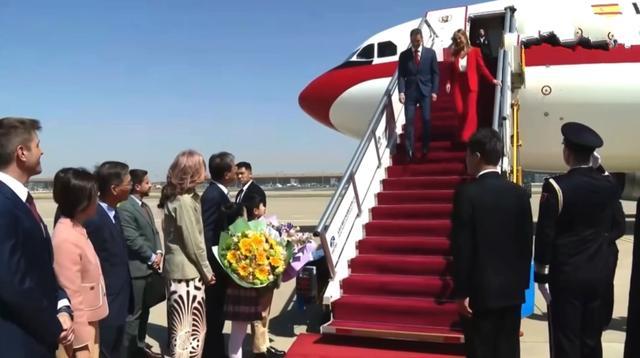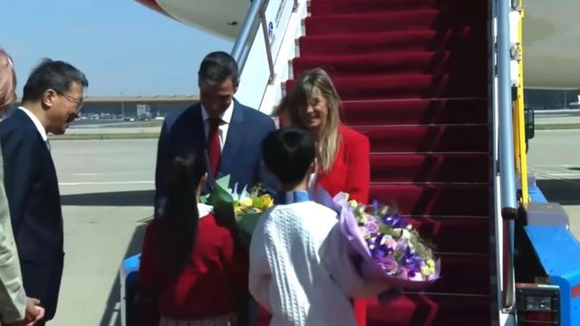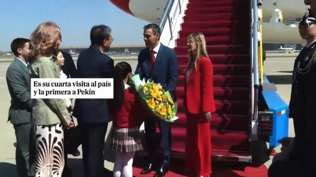 据悉,桑切斯抵达北京机场时是穿着正装,一身深蓝色西服系着中国红领带,彰显绅士又有范儿,还有他的妻子也是穿着职业装,不过颜色是靓丽的红色,显得热情又抢镜。